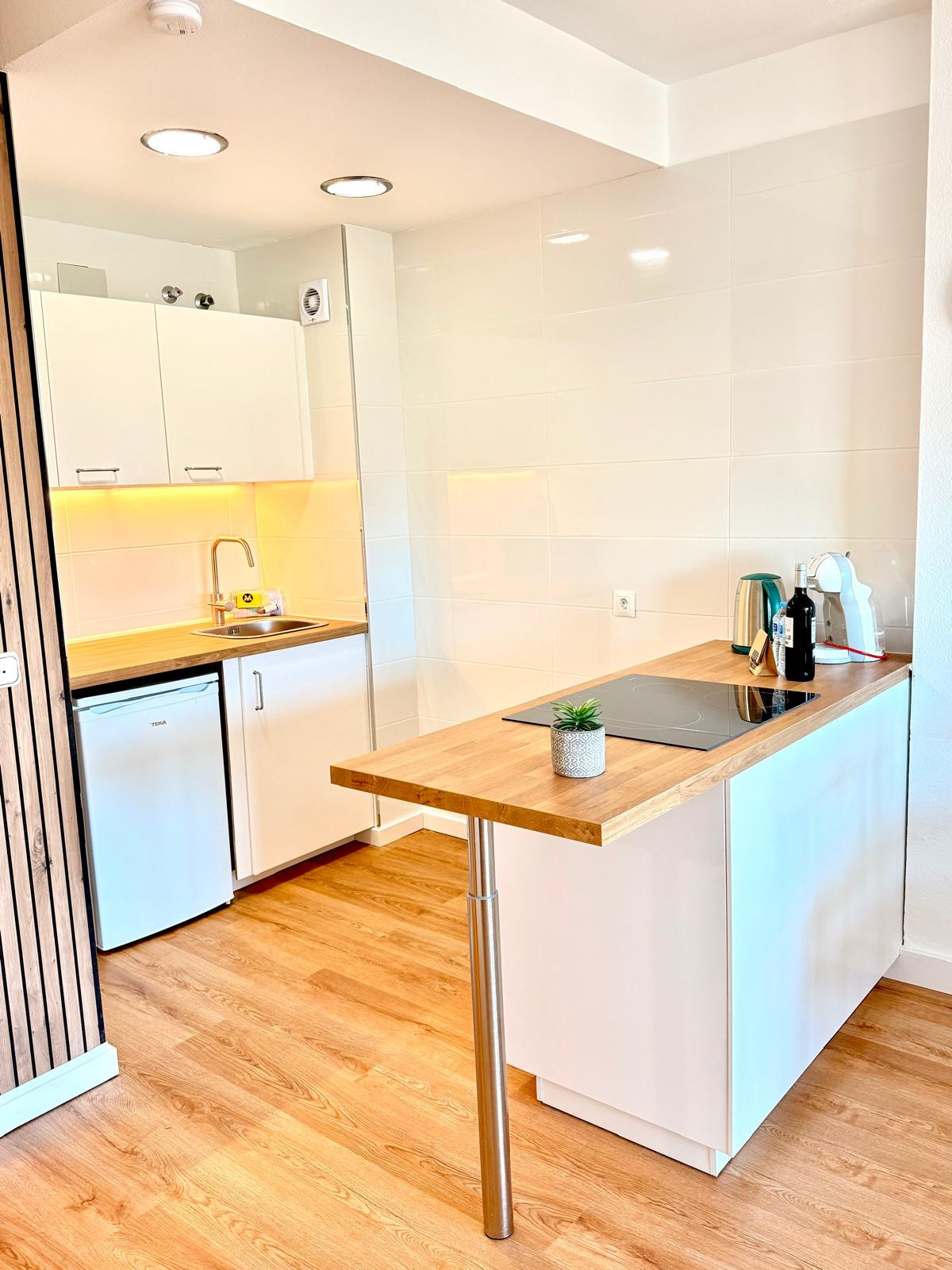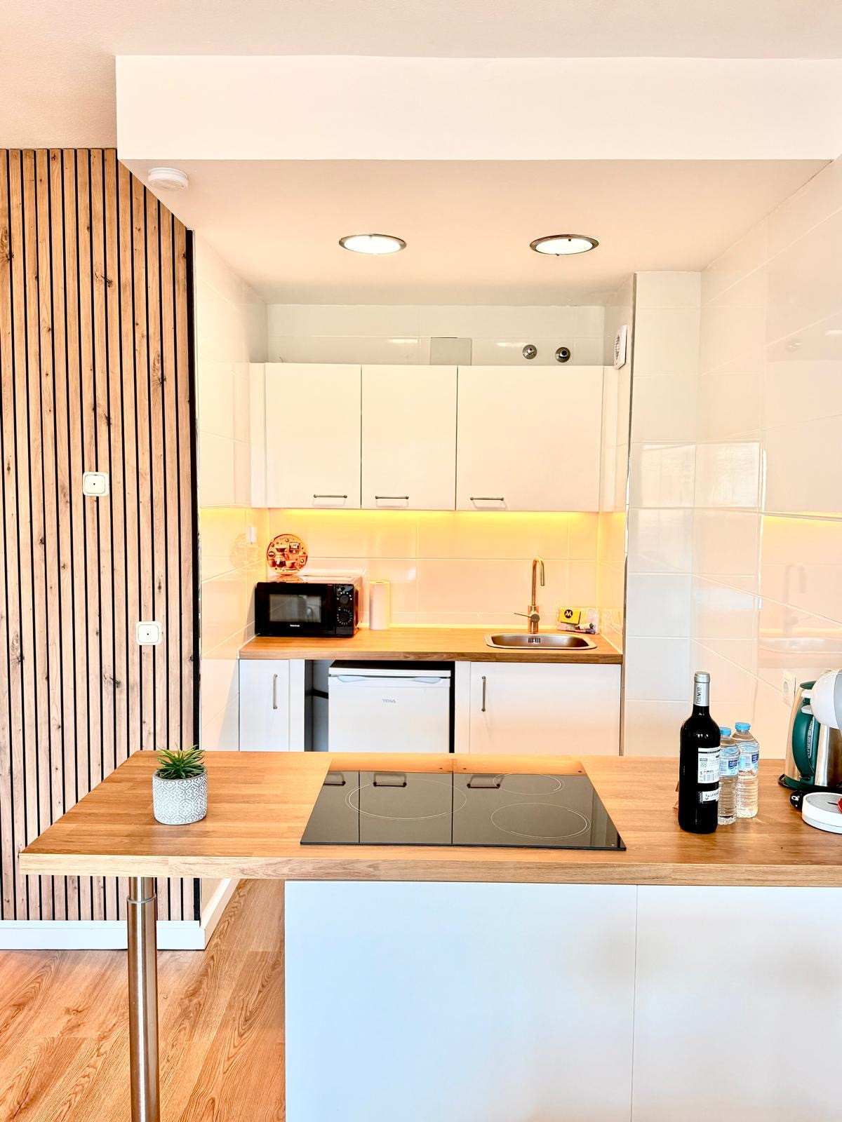 🔹 Equipped kitchen: American-style kitchen with a wooden bar, equipped with fridge, microwave, kettle, electric hob and basic kitchenware.