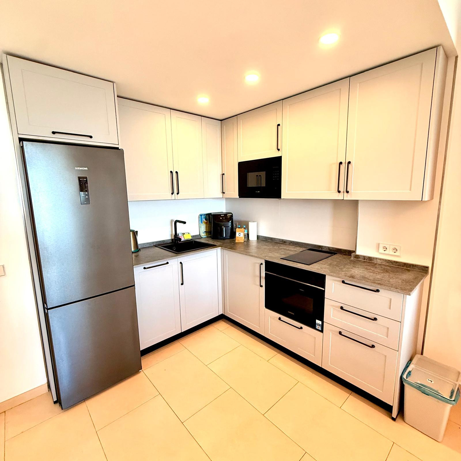 Fitted kitchen: microwave, fridge, freezer, toaster, kitchen utensils