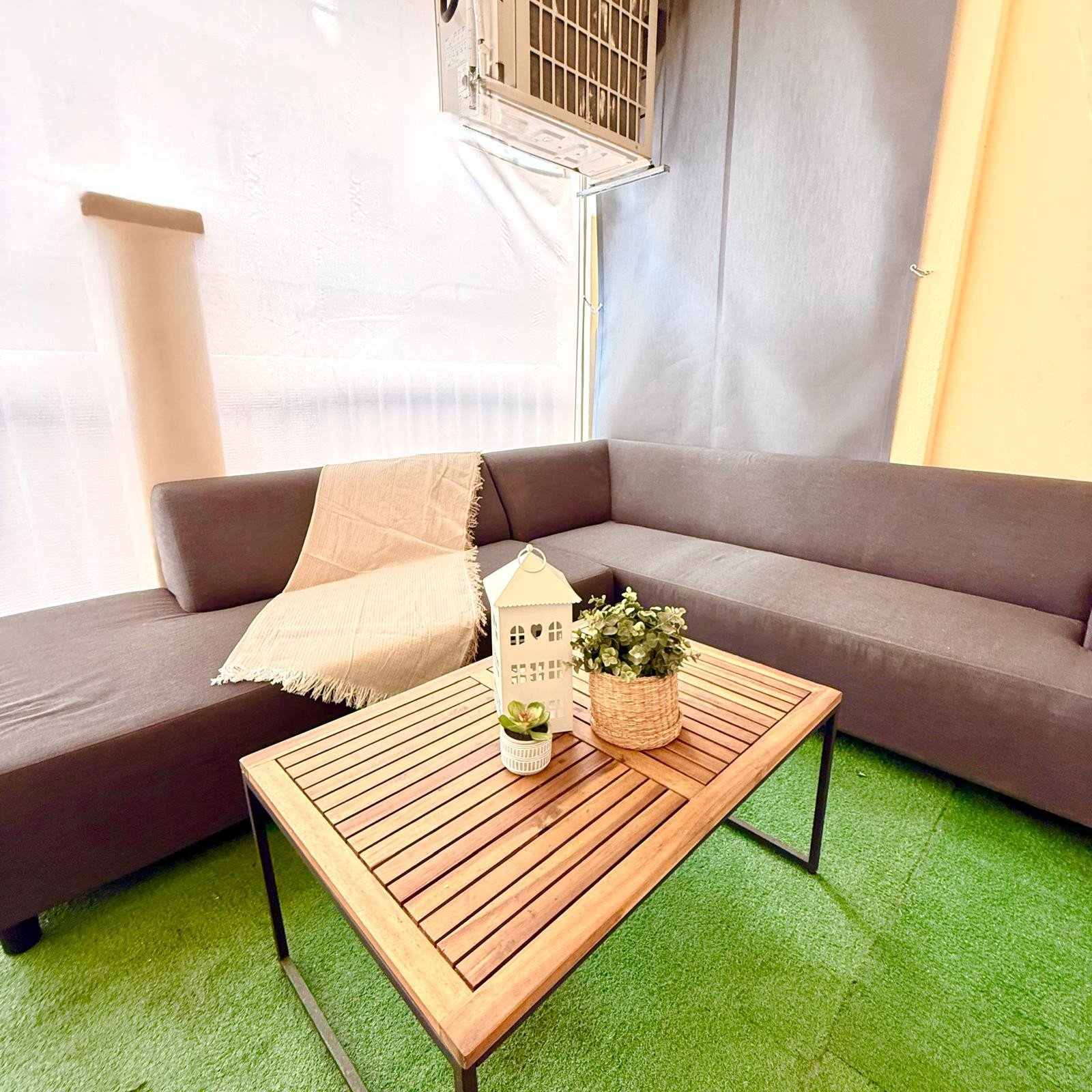 In front of the kitchen is its large open-plan living room that fills with light from the large doors leading to the private terrace. The living room is beautifully decorated and has a large 4-seater sofa bed and air conditioning.
