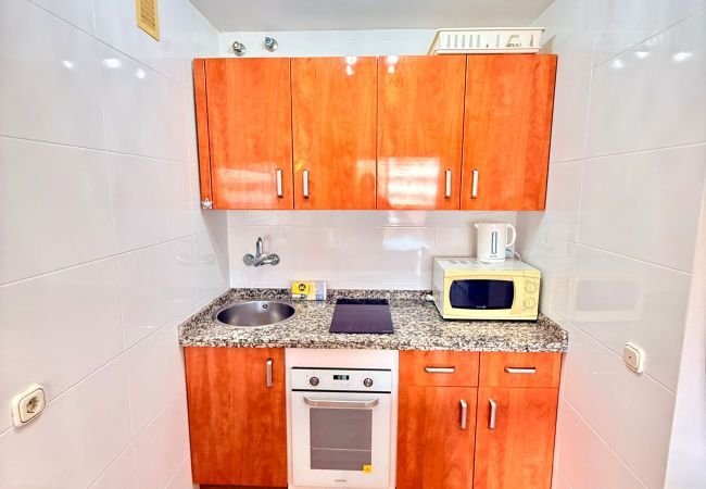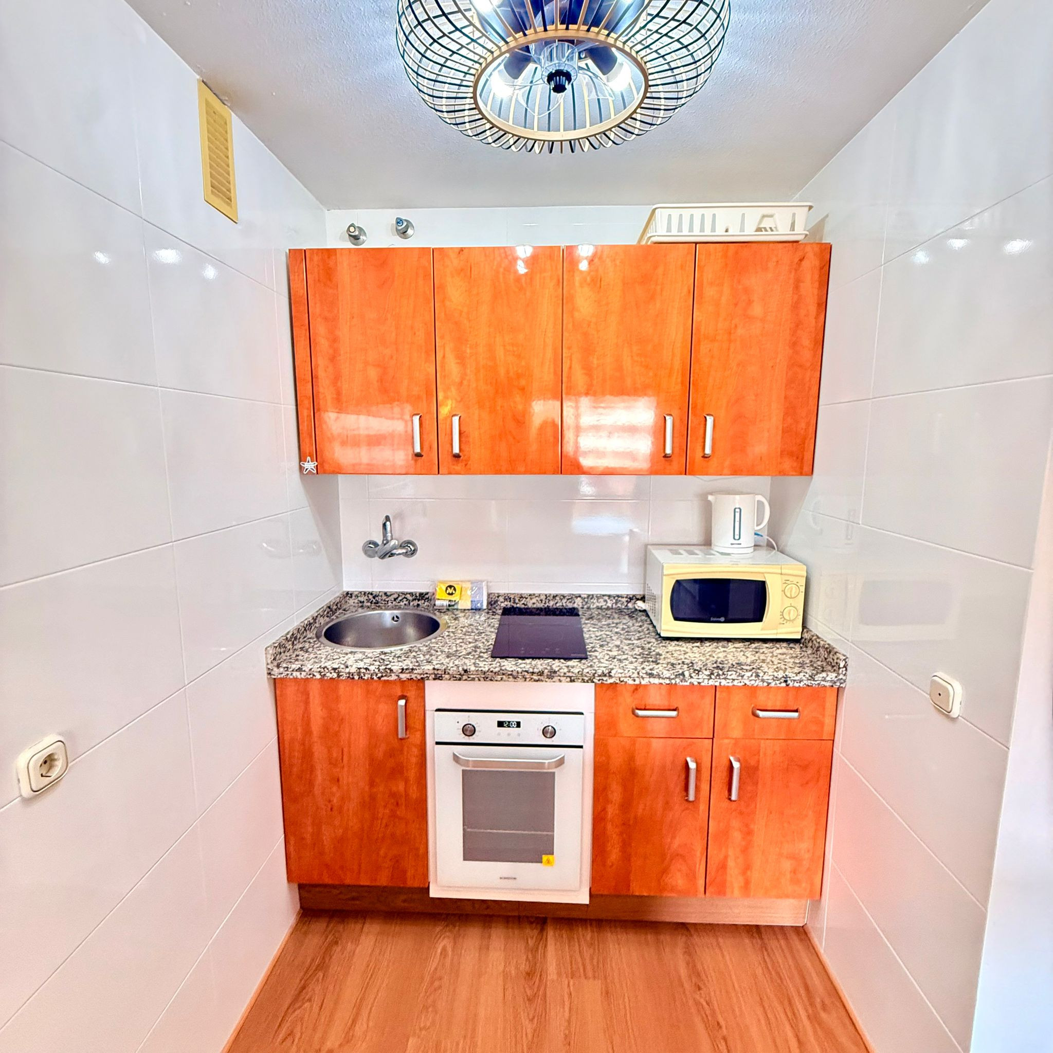🔹 Equipped kitchen: American-style kitchen with a wooden bar, equipped with refrigerator, microwave, water kettle, electric stove, and basic kitchenware.