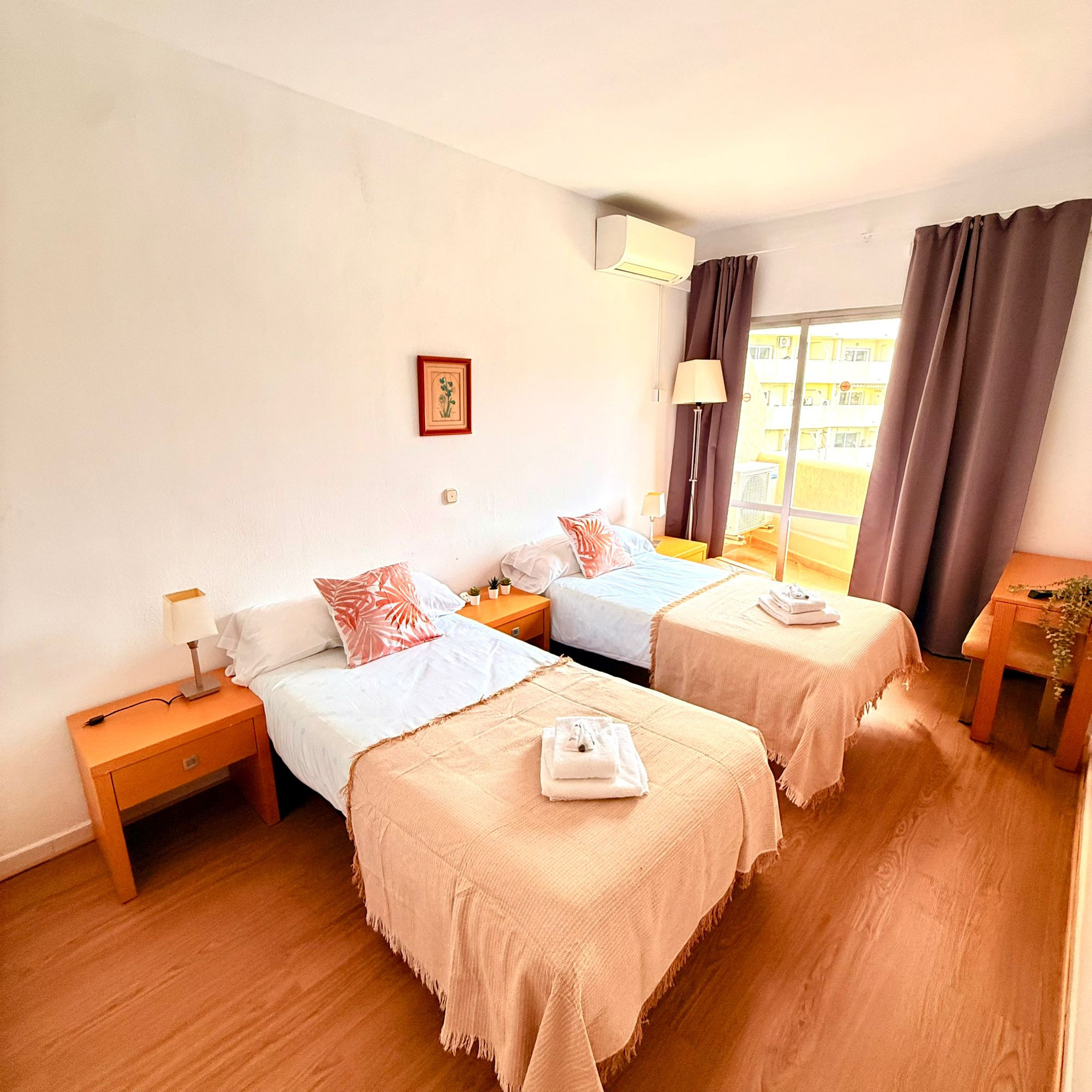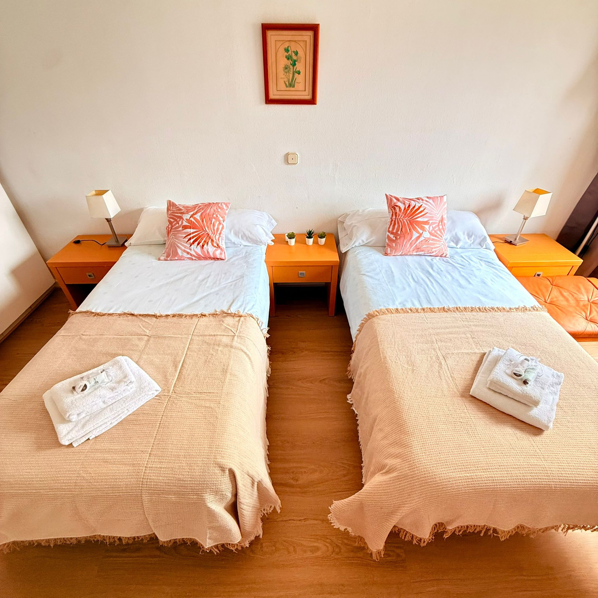 🔹 Master bedroom: It has two single beds joined together, bedside tables, air conditioning and direct access to the terrace. Includes bedding and towels for guests.