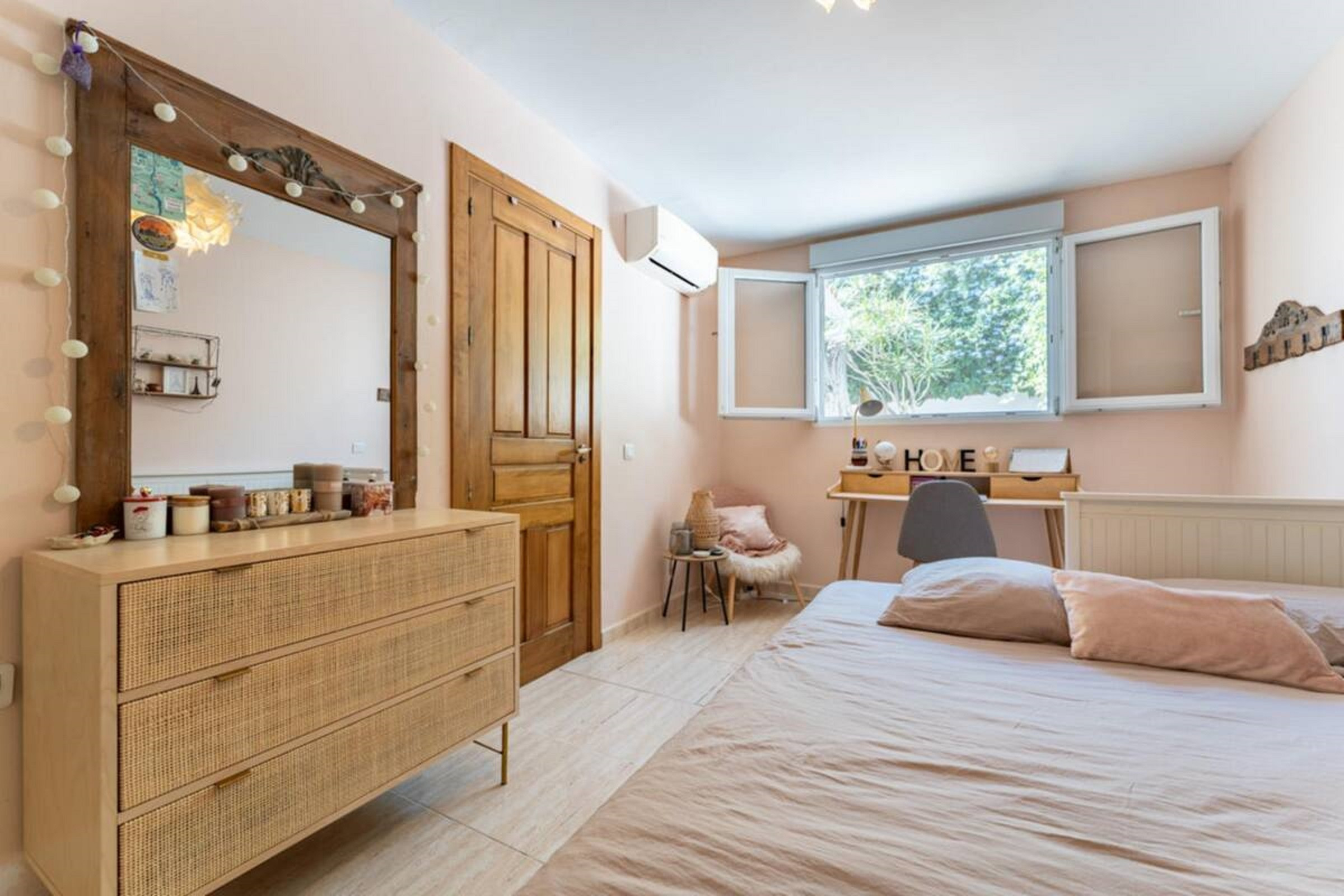 The villa boasts four elegantly appointed bedrooms, each designed with comfort and relaxation in mind. All bedrooms feature double beds and modern air conditioning systems to ensure a restful night's sleep. Two of the bedrooms have their own bathrooms, providing added privacy and convenience, while the other two bedrooms share a beautifully designed Jack and Jill bathroom.